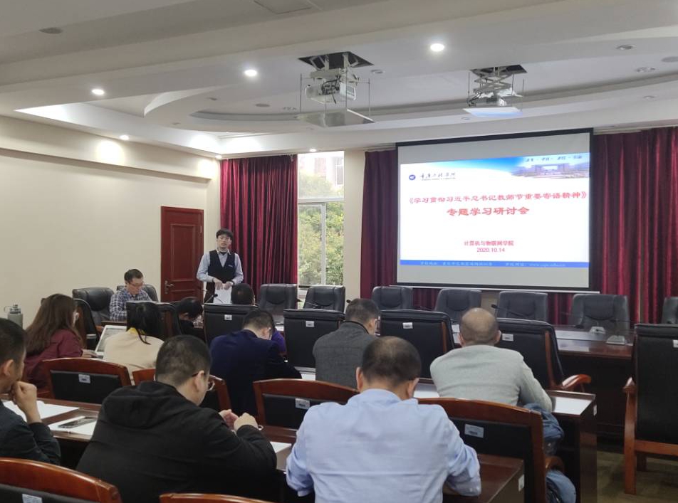 本网讯(文/图 刘晓佼)2020年 10月14日下午15点,计算机与物联网学院在学校第七会议室召开了《学习贯彻习近平总书记教师节重要寄语精神》专题学习研讨会,会议由院长助理李波主持,全院教师参加了会议。