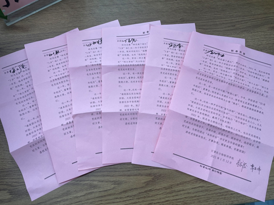 本网讯(文/图 潘晓宇)新春佳节即将来临之际,为让全院教职工感受到“娘家人”的关怀与温暖,2022年1月14日,计算机与物联网学院院领导协工会委员,组织开展春节慰问活动。在学院年终总结大会上,院长李发陵、党总支书记覃华伟对今年学院教学、就业、党建、学生等各方面工作给予了肯定,对老师们辛勤的付出表示由衷的感谢,学院领导还为每位教职工书写了一封充满温情的祝福信,特别的爱给特别的你。
