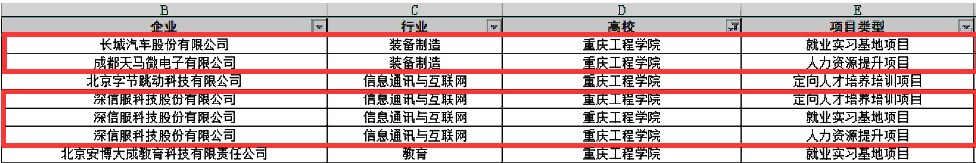 我院根据专业开设情况,先后与深信服科技股份有限公司、长城汽车股份有限公司、成都天马微电子有限公司等企业积极沟通对接,围绕“就业实习基地项目”、“人力资源提升项目”和“定向人才培养培训项目”等方向进行了立项申报,经用人单位专家审核,教育部立项单位信息核查,最终5个项目成功立项。