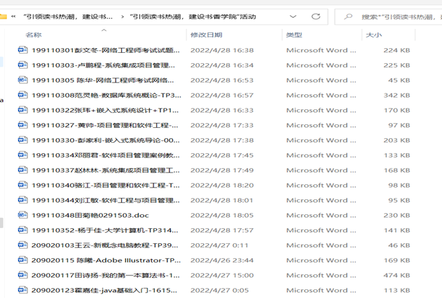本网讯(文/图 刘巧)“书籍是人类进步的阶梯”,为培养学生自觉看书学习的良好习惯,增加学生的课外专业的阅读且更好的利用图书馆资源,提高专业图书的借阅率,计算机与物联网学院于2022年4月28日开展了“引领读书热潮,建设书香学院”活动,引导广大学生多读专业书籍,形成专业读书热潮,同时促进班风、校风、学风以及文明校园建设。
