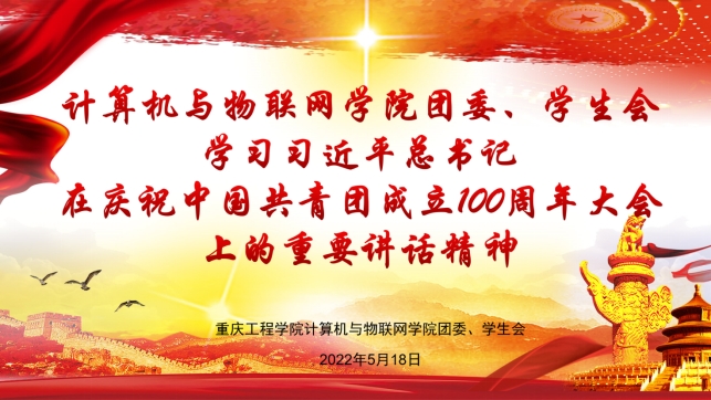 为庆祝中国共青团成立100周年,2022年5月18日16:00–16:30,计算机与物联网学院团委、学生会在6110教室成功举行“学习习近平总书记在庆祝中国共青团成立100周年大会上的重要讲话精神”主题会议。参加本次会议的人员有计算机与物联网学院团委书记张景冬以及团委、学生会全体成员。