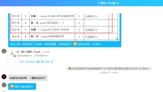 本学期共有20级计算机科学与技术专业7个班开设《嵌入式操作系统》课程,由课程组长雷仕英及成员宋远峰两位老师承担。为了开好局,备好课,课程组进行了首次集中备课。在备课过程中,两位老师首先对本期课程教学大纲及进度计划安排进行了研读,然后针对本门课程特点、备课的重难点、授课方式、教案书写等问题进行了认真讨论。经过充分交流后,两位老师对备课方案达成了共识。