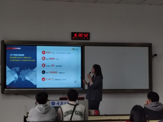 此次招聘会,上海海典软件股份有限公司重庆分公司提供了“SAAS软件实施运维工程师、售后工程师”两个招聘岗位,共拟招聘11人。公司招聘专员详细介绍了公司的基本情况、主营业务及当前的经营状况。在与同学们进行互动的同时,也对同学们所关心的问题作出了详细解答。在宣讲结束后,公司还在6101教室对同学们进行了初步面试。