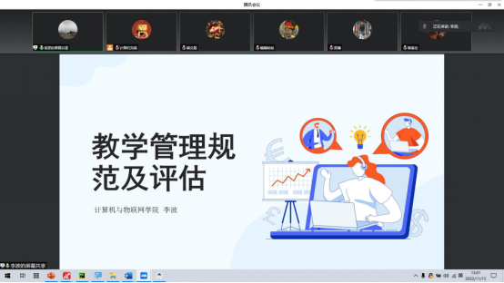 本网讯(文/图 李永祥) 11月15日下午,计算机与物联网学院通过腾讯会议开展主题为“教学管理规范及评估”的新教师集中培训。本次培训由教学副院长李波主讲,学院全体新入职教师参加。