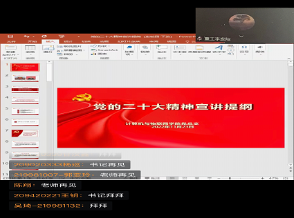 2022年11月23日下午,计算机与物联网学院党总支利用腾讯会议组织全体教职工在线上进行党的二十大精神学习活动。学院李发陵院长主讲。