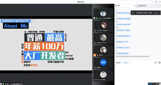 本网讯(文/图魏克非 杨安进)为帮助同学们了解未来的就业方向,提前做好自己的职业规划,我院于2022年12月4日下午,通过腾讯会议组织了主题为“计算机行业发展及就业展望”的就业指导讲座,300余名大一同学参加了此次活动。