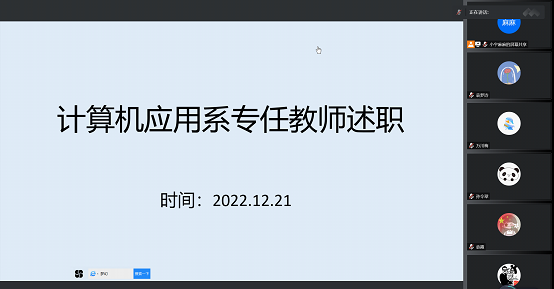 本网讯(文/图 袁梦诗)2022年12月21日下午,计算机应用系在腾讯会议举行教师述职大会。会议由王慧英系副主任主持,计算机应用系全体老师参加了此次会议。