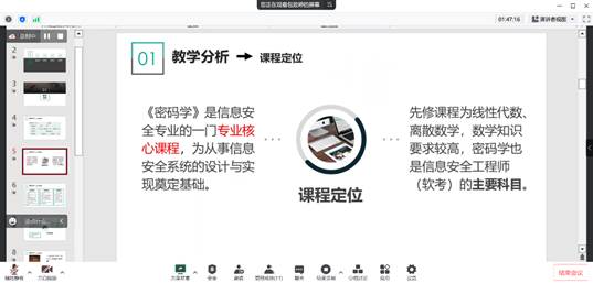 参赛教师根据所授课程的特点,精心准备,分别从课程定位与目标、教材及教学内容、学情、教法学法、教学过程、考核评价、教学素养等方面进行了清晰的阐述。比赛过程中,参赛教师精神饱满、激情四射,他们用抑扬顿挫的语言、娴熟的技巧以及合理的说课方法,不仅展示了教师的个人风采和深厚学识,而且将他们对课程的理解剖析的深入透彻,展现了当代教师昂扬向上、锐意进取的良好精神风貌。