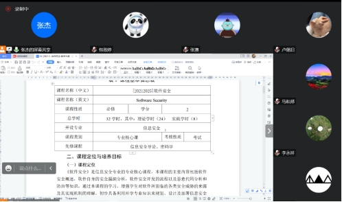 其次,对《密码学》、《软件安全》等课程进行线上集体备课,课程组全体老师参会。课程组重点就较好组织课堂教学、关注课堂教学效果和辅导答疑等教学环节问题进行深入探讨,每位老师都献计献策,分享自己成功的经验,对开学后教学的开展起到很好的推动作用。