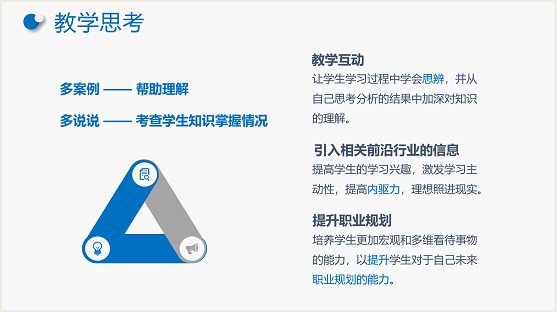 按照《项目管理(B)》课程教学大纲要求,课程组长首先进行了说课,说课内容包含教学分析、教学设计、教学案例、教学思考四个方面,分别从课程定位、基本信息、教学目标、课程内容、考核标准、学情分析阐述了教学分析,从教学资源、教学方法、课程思政阐述了教学设计,以第一节的讲授内容和方法为例阐述了教学案例,最后总结了教学思考。