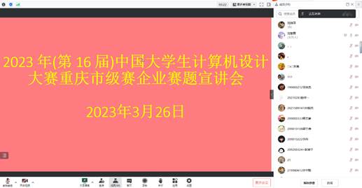 本网讯(文/图 刘逸琛)2023年3月26日上午,中国大学生计算机设计大赛重庆市级赛组委会召开企业赛题宣讲会。会议由重庆市赛负责人刘慧君主持,计算机与物联网学院多位竞赛负责人、指导教师和参赛学生出席了本次会议。