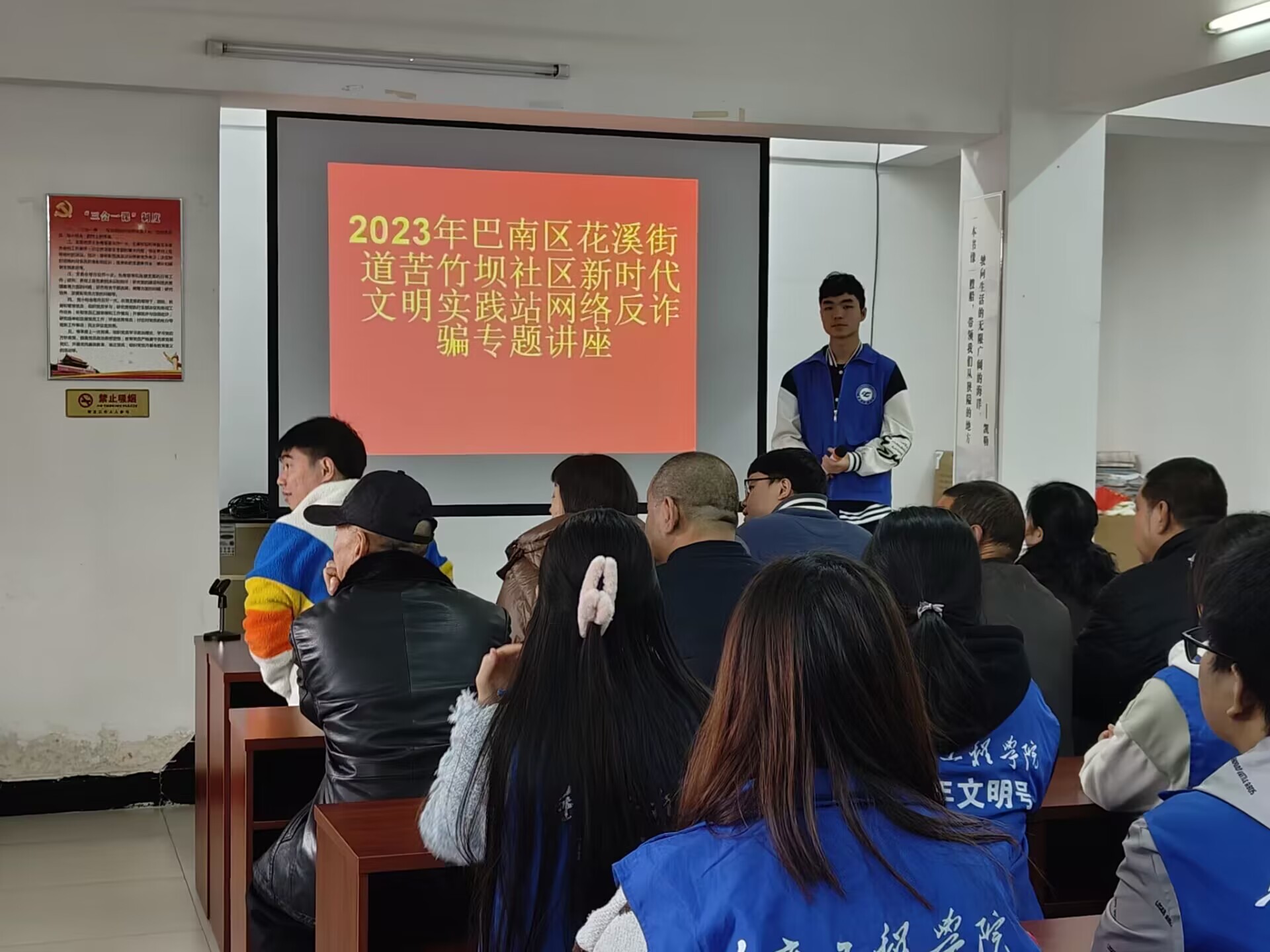 到达苦竹坝社区后,志愿者派出代表进行了有关于现代网络技术和网络诈骗的宣讲,对社区工作人员和居民进行了讲解和科普。之后尤洋老师也上台分享了对网络诈骗的看法和见解。在志愿者们的共同完成下,本次活动圆满结束。