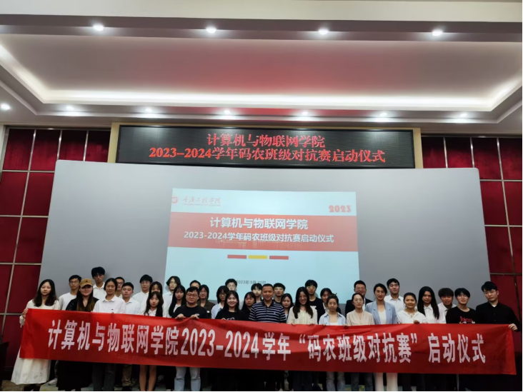 本网讯(文/郝恬 图/郝恬)为加强学风建设,营造“比学赶帮”的氛围,计算机与物联网学院“码农班级对抗赛”启动仪式于2023年9月21日12:30在阶梯报告厅举行,参加本次仪式的有党总支书记覃华伟、分团委书记郝恬、副书记张运、全体辅导员以及全体班委。