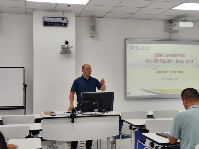 本网讯(文/图 熊文超)依照《重庆工程学院教务处关于做好2024届本科毕业设计(论文)工作的通知》(教函〔2023〕109号)文件,以及《重庆工程学院本科毕业设计(论文)管理办法(修订)》(渝工程院教〔2020〕67号)和专业人才培养方案要求,计算机与物联网学院于周三下午,在7911召开2024届毕业设计(论文)选题指导会议。会议主题为选题审批表、任务书撰写指导。会议由办公室主任罗桓主持,院长李发陵主讲,全体专任教师参会。