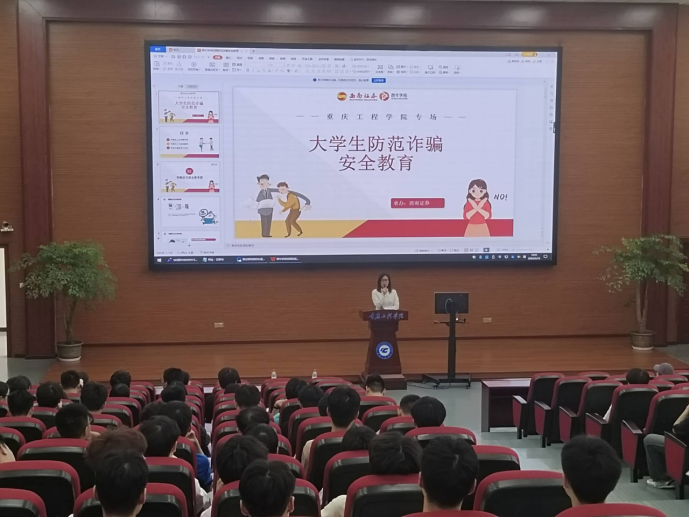 本次讲座由西南证券股份有限公司重庆第三分公司中级业务经理汪丹丹主讲。计算机与物联网学院同学参加。汪经理向大学生们介绍了虚假兼职、网络购物、刷单等常见的骗局,并提醒他们保持警惕。鼓励大学生主动学习相关知识,了解新型诈骗手段的演化和应对策略,提高自身的防范能力。