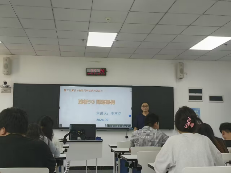 讲座主要从 5G 的网络接入、业务承载、网络核心以及 5G 改变社会等四个方面进行了深入解读。主讲人李常春以丰富的专业知识和生动的案例,为学生们呈现了 5G 网络架构的全貌,首先,专家对5G网络接入技术进行了细致的分析,阐述了5G如何在高频率、大带宽和低延迟方面实现技术突破,以及这些技术进步如何为用户带来前所未有的网络体验。