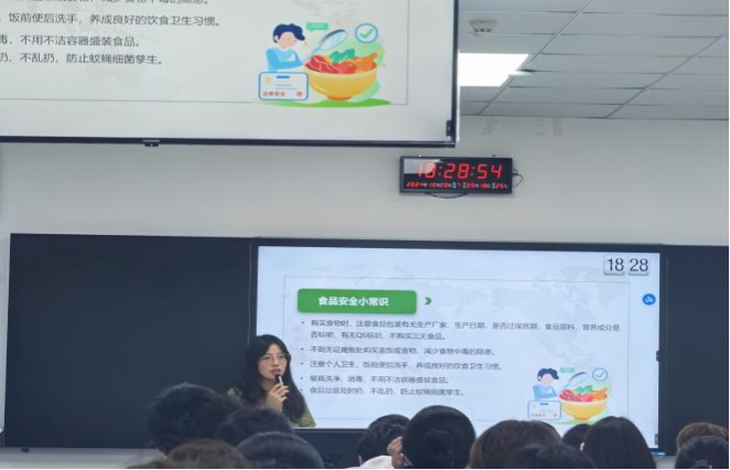 在本周班会,李心怡、王玲等辅导员老师以食品安全为主题,向同学们讲解食品安全的一些真实案例,通过案例看到食品存在的诸多安全问题,再系统地给同学们讲解食品安全知识,和大家一起探讨如何在日常饮食中降低风险,保障生命安全。班会上,同学们通过学习有关安全知识,树立食品安全意识,在购买食品时要进行选择和鉴别,促进学生安全、健康成长。