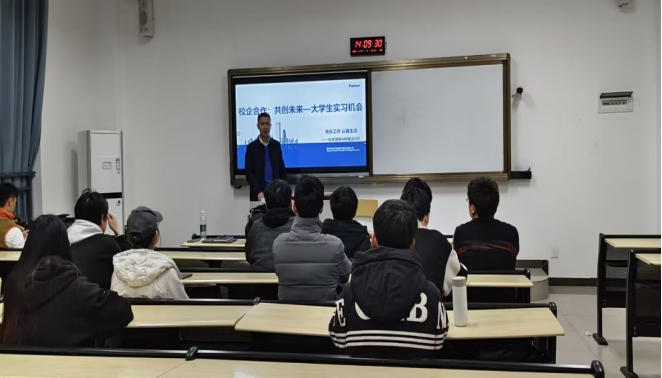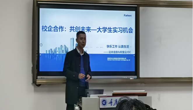 为助力同学们了解企业需求,深圳法本信息技术股份有限公司杭州分公司校企合作负责人廖总不辞辛劳,专程从杭州奔赴重庆进行宣讲。廖总详细介绍了公司的发展历程、业务范围以及招聘岗位,并通过生动的幻灯片展示和讲解,与同学们进行了积极互动。