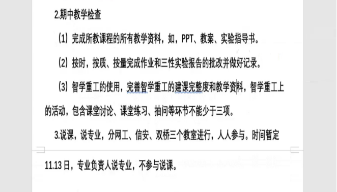 (3)智学重工的使用,完善智学重工的建课完整度和教学资料,智学重工上的活动,包含课堂讨论、课堂练习、抽问等环节不能少于三项。教师需要充分利用智学重工这一教学平台,完善课程的建设。智学重工的建课完整度和教学资料的完善程度是检查的重要内容。教师应确保在智学重工上开展的课堂活动丰富多彩,包括但不限于课堂讨论、课堂练习和抽问等环节。这些活动的设置应当不少于三项,以确保学生能够在课堂上积极参与,提高学习效果。同时,教师应记录这些活动的开展情况,以便于后续的教学评估和改进。