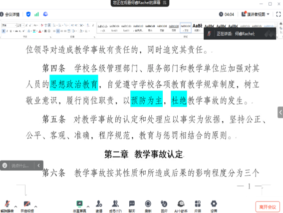 何睿主任首先对《教学事故认定及处理办法》解读。解读教学事故类别:一般教学事故、严重教学事故、重大教学事故,对何种行为会造成哪类教学事故进行解读,对容易忽视的可引起教学事故的情况做重要解读,提醒教师注意这些问题,引起重视,不触碰这个“红线”。对何种行为会引起严重教学事故及重大教学事故进行特别强调和解读,引起老师重视。