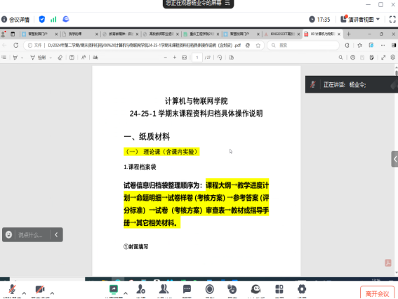 会议最后,杨业令主任对24-25-1学期末资料归档准备工作做相关安排,提醒老师们提前准备相应材料,避免后期造成任务堆积。提醒老师们查看服务器中归档材料规范性要求,做到对期末材料的规范归档,其中特别提出课程大纲及进度计划表中编制人,审核人处要使用手写签名。材料规范打印,除过程性成绩册其余材料双面打印。期末成绩要录入正确。期末电子材料及时归档上传服务器。