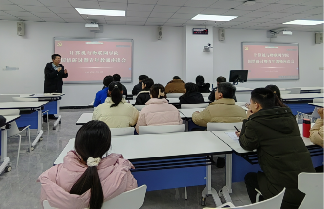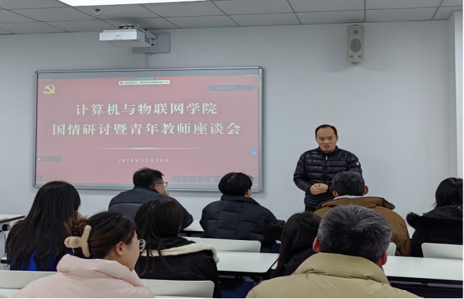 为深入了解访学教师和青年教师的思想动态和成长路径及需求,计算机与物联网学院于12月18日在第七教学楼1101会议室召开国情研讨暨青年教师座谈会。学院党总支书记黄涛、全体教师参加了会议。会议由党总支书记黄涛主持。