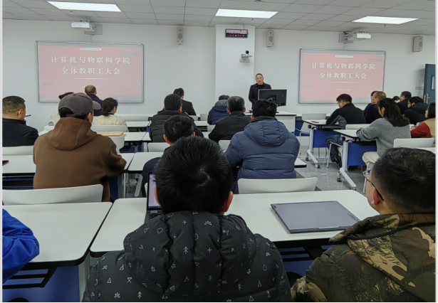 本网讯( 文/图 罗桓 魏登雪)3月12日下午,计算机与物联网学院在71101召开教职工大会,宣布有关干部任职事项。会议由学院院长李发陵主持,副校长谭明术、人事处长明延艳出席会议。