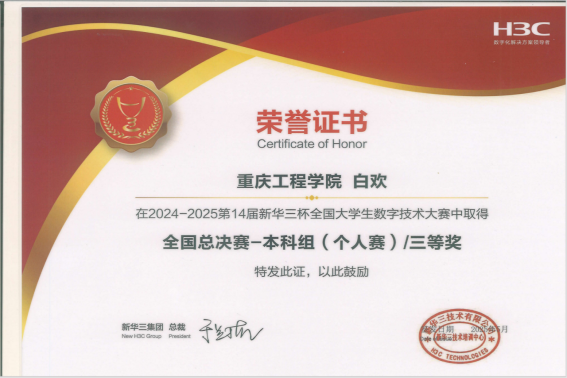 本网讯(文/图 张杰)2025年5月9日-5月11日,第十四届新华三杯全国大学生数字技术大赛总决赛在杭州举行。来自我校计算机与物联网学院的白欢同学通过理论答题和上机实验,最终斩获全国三等奖的优异成绩。