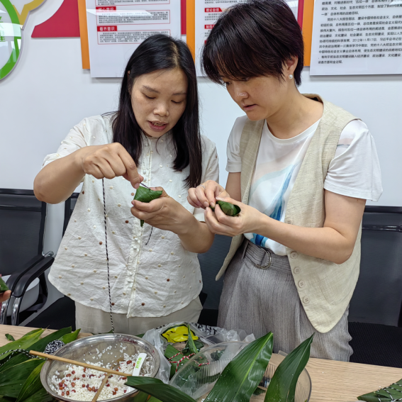 同时,活动特别设置了包粽子环节,在经验丰富的老师傅或教职工的指导下,师生们纷纷动手尝试,捋粽叶、填糯米、放馅料、裹粽子、系棉线。大家互相学习,手把手教学,欢声笑语中,一个个形态各异的粽子逐渐成型。这不仅是一次生动的劳动实践,更是一次沉浸式的传统文化体验,让参与者切身感受到了端午粽香里的文化韵味和浓浓情谊。