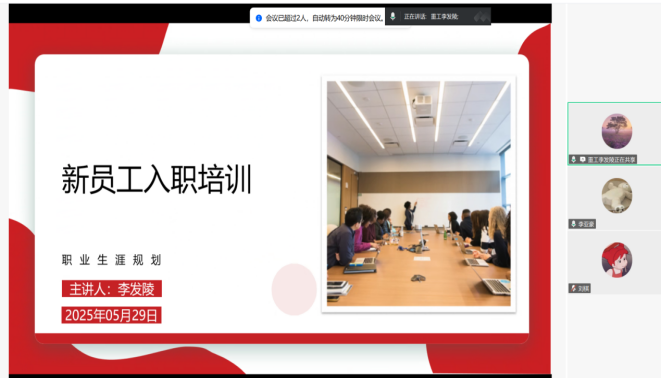 本网讯(文/图 李亚豪)2025年05月29日,计算机与物联网学院通过线上腾讯会议的形式,组织开展了一场以“新教师职业发展规划”为主题的新教师集中培训活动。此次培训由学院李发陵院长亲自主讲,学院全体新入职教师踊跃参加,共同开启了一场关于职业生涯规划与教学指导的学习之旅。