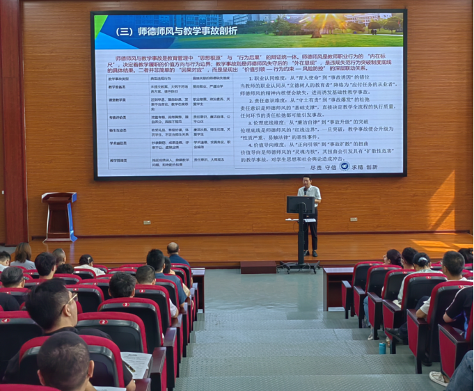 随后,黄涛书记聚焦加强师德师风建设、引领教师争做“四有”好老师的核心目标,开展了教职工政治理论与师德师风专题培训。与会人员共同深入学习了《新时代高校教师职业行为十项准则》及学校党委发布的《师德师风负面清单及失范行为处理办法》(渝工程委〔2024〕13号)等重要文件。同时,为强化教师的职业荣誉感、责任感和使命感,黄涛书记带领全体教职工肃立,握拳举起右手,进行了庄严的师德宣誓仪式,并现场签署了《重庆工程师德师风承诺书》,以实际行动践行育人初心。