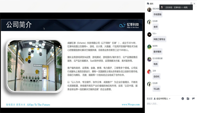 (本网讯 文图/魏克非)2025年9月17日19时,成都忆享科技有限公司专场线上招聘会通过腾讯会议顺利举办,本次招聘会由公司税莉女士主讲,2022 级全体在校学生云端参会,为即将步入求职阶段的学子搭建起优质就业桥梁。