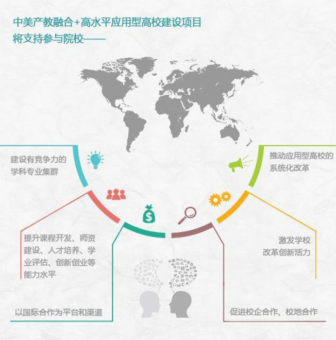 2017年10月,中美应用技术教育“双百计划”全面升级为中美产教融合+高水平应用型高校建设项目。同时,积极开展实施项目2.0平台解决方案,在原本设计制定人才培养方案体系、对标国际专业认证标准、推动中美专业共建的基础上,搭建线上线下相结合的中美产教融合国际教育协同合作云服务平台,最终形成产教融合国际教育新生态。