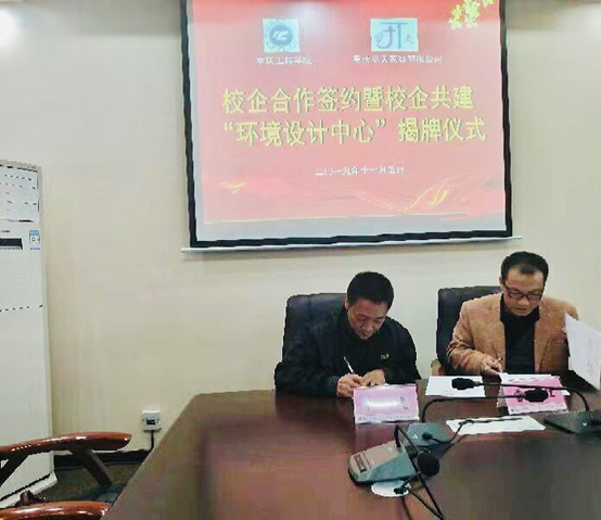 在与会人员的共同见证下,雷江院长、曾建董事长分别代表校企双方签订了校企合作协议,举行了“环境设计中心”揭牌仪式。