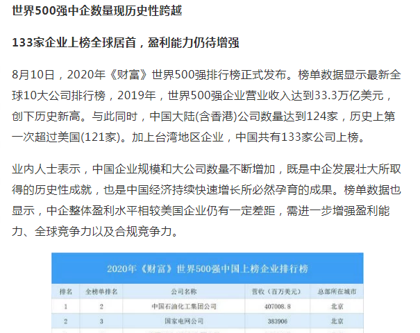 2020年财富世界500强中国企业名单 133家中企最新排名排行榜