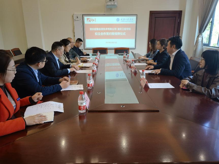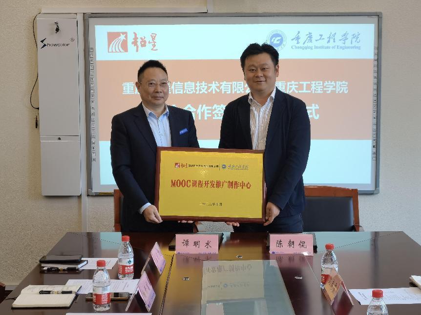 10月31日下午,学校在第六会议室举行重庆超星信息科技有限公司-重庆工程学院校企合作暨授牌仪式,党委书记、政府督导专员谭明术、教务处处长杨倩、信息中心主任皮小军、数字艺术学院院长杨开富、副院长庄涛文以及职能部门相关人员,超星集团副总经理、西南区总经理陈朝侃、超星集团重庆分公司副总经理赵汝林等出席仪式。仪式由教务处处长杨倩主持。仪式上,杨处长介绍了出席仪式的领导,并就双方合作的背景进行了说明。超星集团陈朝侃副总经理发言介绍了超星集团的基本情况、体系架构、主营业务和校企合作案例等,指出超星集团长期与学校保持着良好的合作关系,在图书馆资源、智慧教室等方面都有很好的合作,特别是智慧教室的建设已成为双方合作的经典案例,双方具备非常殷实的合作基础。此次合作,学校对超星提出了更加深入的合作期望,公司将积极响应,与学校在深化校企合作、产教融合,加强应用型人才培养方面共同努力,在MOOC课程开发推广制作中心、校外实践教学基地等项目上深度合作,力争取得更加丰硕的合作成果。谭明术书记简要介绍了学校校企合作、产教融合人才培养模式的内容和未来规划。指出超星集团在学校建设发展中提供了高质量的服务,校企间具备良好的合作基础。当前学校正在强化校企合作、产教融合人才培养模式内涵建设,提升应用型专门高级人才质量,引企入校,特别是优质企业的需求紧迫。希望双方能够在此次MOOC课程开发推广制作中心共建中能够紧密合作、扎实推进、快速落地,打造一个优质的示范型课程共建基地。仪式上,学校谭明术书记与陈朝侃副总经理共同签订了《校企共建“MOOC课程开发推广制作中心”建设合作框架协议》,并进行了授牌。仪式后,校企出席仪式人员合影留念。据悉,学校与超星集团共建“MOOC课程开发推广制作中心”将在MOOC课程开发、制作、推广,国家级、市级精品课程资源共享,课程开发人员培养等方面展开深度合作,对促进学校建立线上优质课程体系,打造优质线上精品资源共享课程具有重要意义。