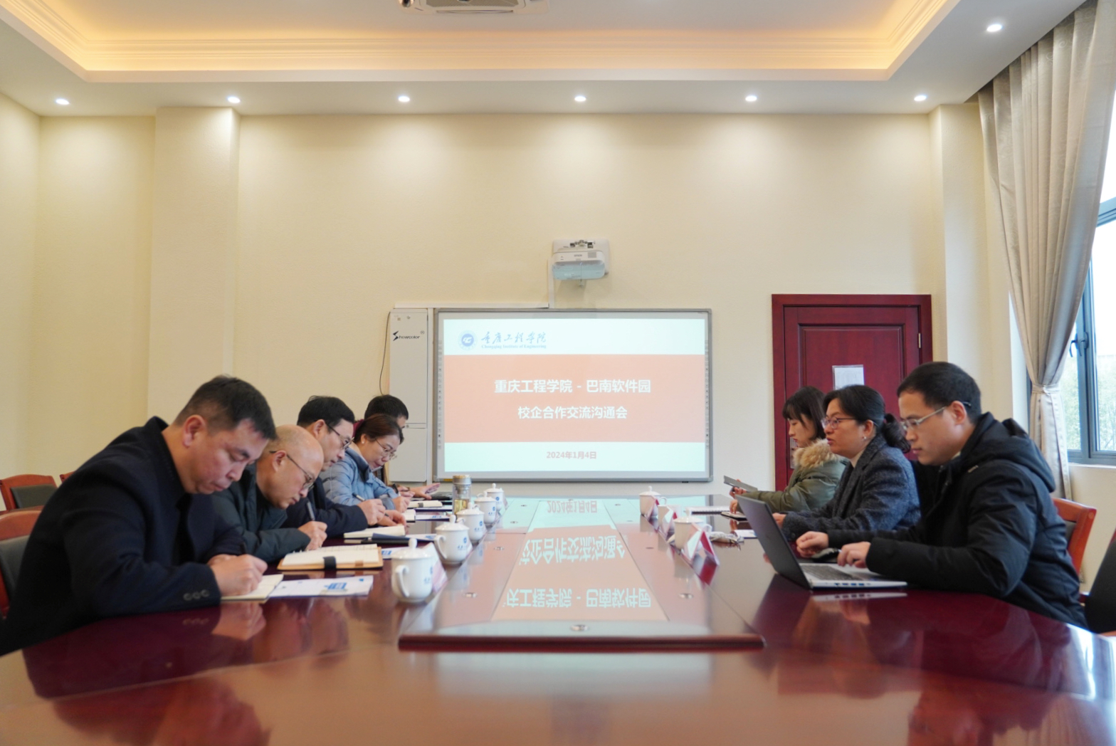 1月4日下午,巴南区软件园总经理杨向荣等一行到校,与学校党委副书记,常务副校长张业平、教务处副处长许欢欢、创新创业学院副院长王锋、招生就业处杨军等召开校企合作年度总结沟通会。