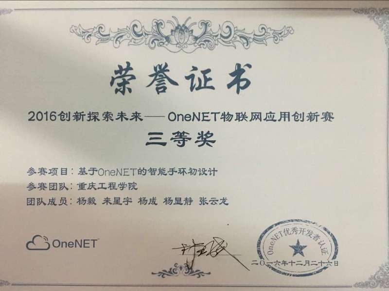 本网讯(电子与物联网学院 陈成瑞)我校物联网+创新孵化区学生团队再创佳绩, 2016年12月26日,由中移物联网有限公司举办的创新探索未来——秉火OneNET物联网应用创新大赛中,我校物联网工程大三学生杨毅带领的团队以“基于OneNET的智能手环初设计”项目荣获三等奖。