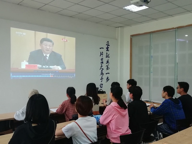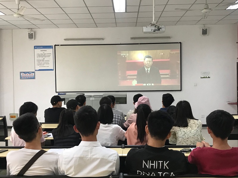 在各班级教室、学生活动中心,在各院系办公室、会议室,学生和老师们齐聚一堂,通过电视、网络、新媒体等途径,积极收看纪念五四运动100周年大会直播,大家认真听取习近平总书记激情洋溢的讲话,并做好笔记。“奋斗是青春最亮丽的底色”“强者,总是从挫折中不断奋起、永不气馁”“青年要保持初生牛犊不怕虎、越是艰险越向前的刚健勇毅”……习近平这些话让师生们热血沸腾,现场不时爆发热烈的掌声。