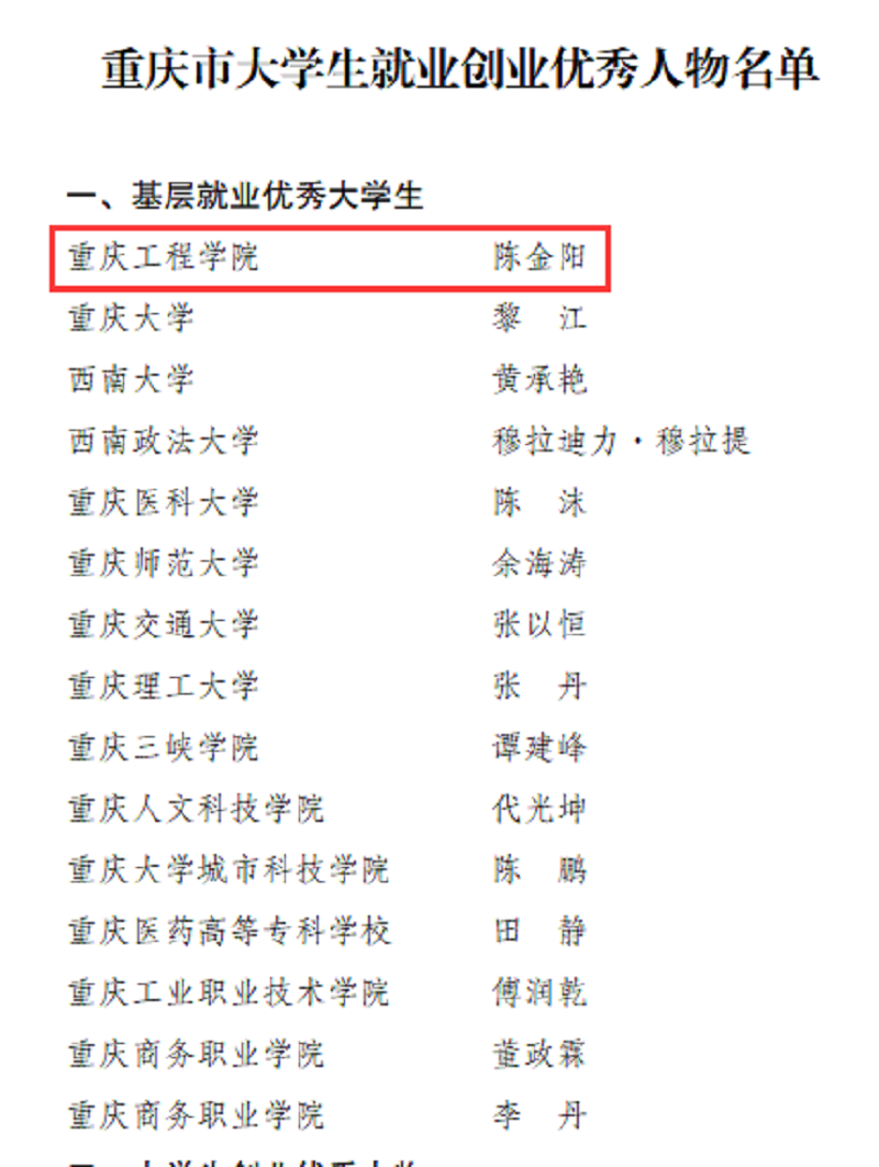 本网讯(招生就业处 杨军)日前,根据《重庆市教育委员会关于公布大学生就业创业优秀人物遴选结果的通知》评选结果,我校管理学院2014级市场营销本科专业毕业生陈金阳获评“基层就业优秀大学生”。