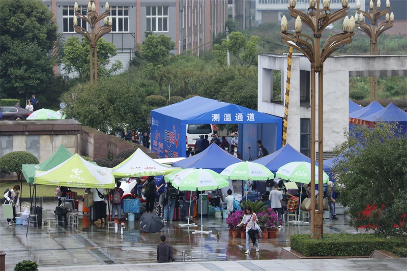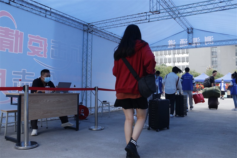 根据当前疫情防控工作要求,全体新生在校门口凭借录取通知书、身份证、健康码,经蓝色通道体温测量无异常后方可进入校园,确保每一位新生的健康安全。