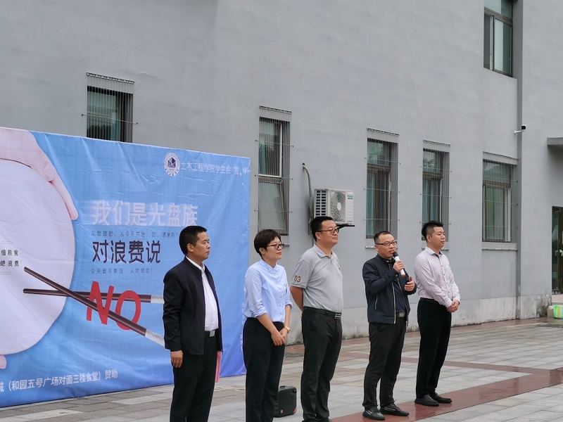 本网讯(文/图 土木工程学院 刘琳靖)为深入学习贯彻习近平总书记重要指示精神,发扬中华民族勤俭节约的传统美德,9月21日中午,土木工程学院在南泉校区和园5号广场举行了“光盘行动”启动仪式。校长助理王建东、学工部部长黄燕、土木工程学院院长雷江出席,校团委书记黄涛带领全院辅导员教师和全院学生代表共计200余人参加启动仪式,仪式由土木工程学院党总支书记李军主持。