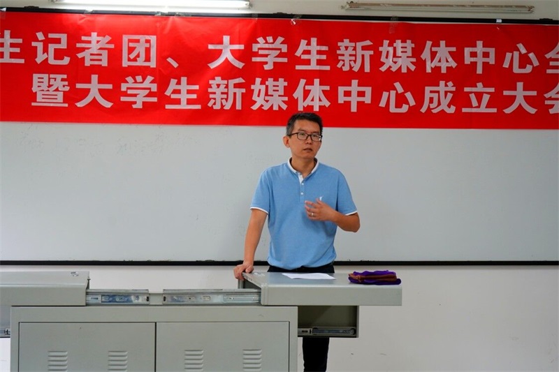 第七届大学生记者团团长汪聂军对所有的新成员表示欢迎,党委宣传部副部长赵鹏涛宣布大学生新媒体中心正式成立。赵部长对往届记者团的工作作了总结,充分肯定了记者团全体成员的工作,还讲解了大学生记者团、大学生新媒体中心的工作性质与相互关系。最后,赵部长希望两个团队之间能够相辅相成、共同努力,在今后的校园宣传、文化建设工作中砥砺前行。