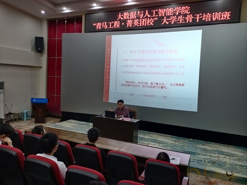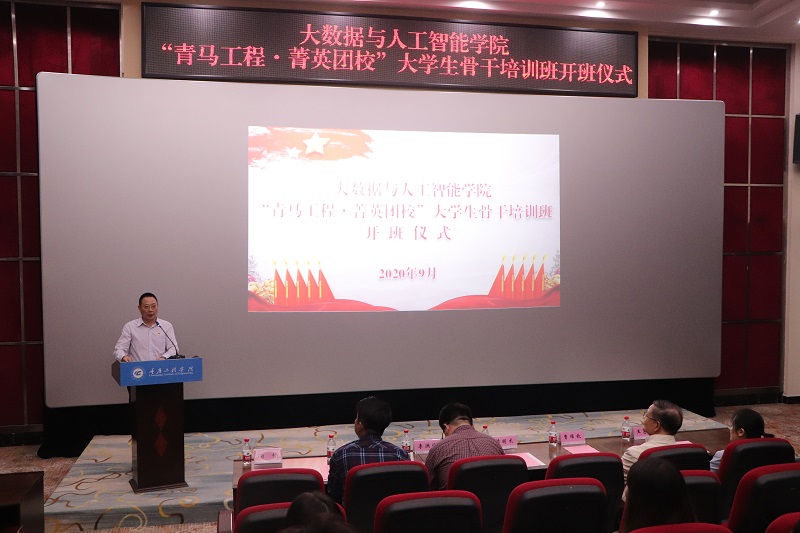 本网讯(文/图 大数据与人工智能学院 唐蕾)在校团委的工作指导下,9月27日,大数据与人工智能学院举办了“青马工程·菁英团校”2020年大学生骨干培训班开班仪式,党委书记谭明术、共青团重庆市委高校工作部干部李洪博、校团委书记黄涛、大数据与人工智能学院党政领导及100余名学员参会。