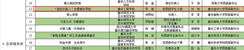 本网讯(文/图 校团委 彭璟)9月30日,共青团重庆委员会发布了《关于2020年重庆市高校“一校一品”优秀团学工作品牌项目立项名单的通报》,当中有136个优秀团学工作品牌获选,我校蓝色引路人”志愿服务项目在“志愿服务类”中获2020年重庆市高校“一校一品”优秀团学工作品牌项目立项。