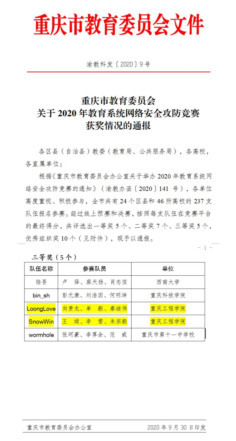 本网讯(文/图计算机与物联网学院 官节福)近日,由重庆市教委举办的2020年教育系统网络安全攻防竞赛决赛结果公布,我校计算机与物联网学院网络安全协会选派学生向贵龙、单毅、秦继伟组成的“LoongLove”团队和王娟、李雪、朱宗毅组成的“SnowWin”团队双双获得三等奖,学校荣获优秀组织奖。