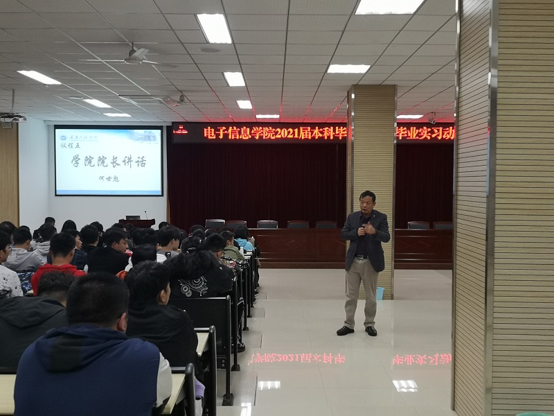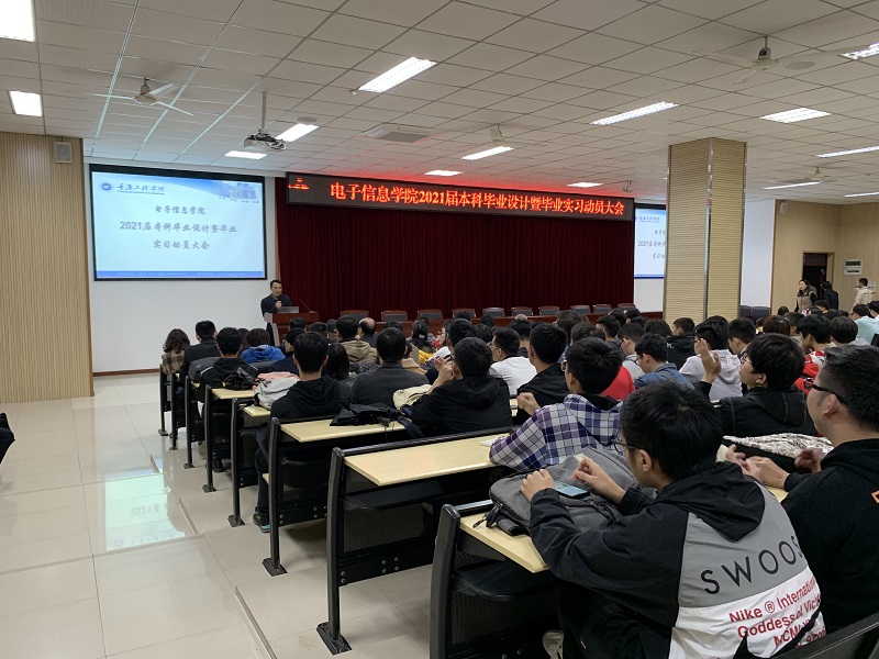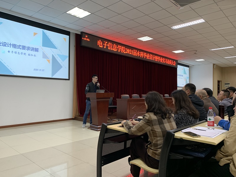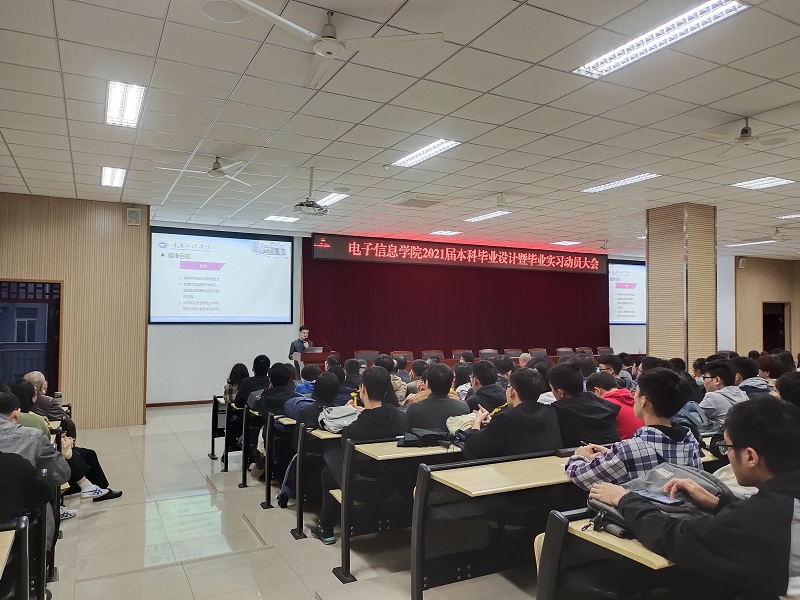 本网讯(文/图 电子信息学院 周树林)为扎实做好2021届毕业生毕业设计和毕业实习工作,树立毕业生统一、严谨、规范的学术意识,10月28日,电子信息学院组织召开2021届本科毕业设计暨毕业实习动员大会。院长何世彪、学院党总支副书记宁俊龙、副院长陈成瑞,各系部、科室以及全体毕业设计指导老师和2021届全体毕业生参加,会议由副院长景兴红主持。