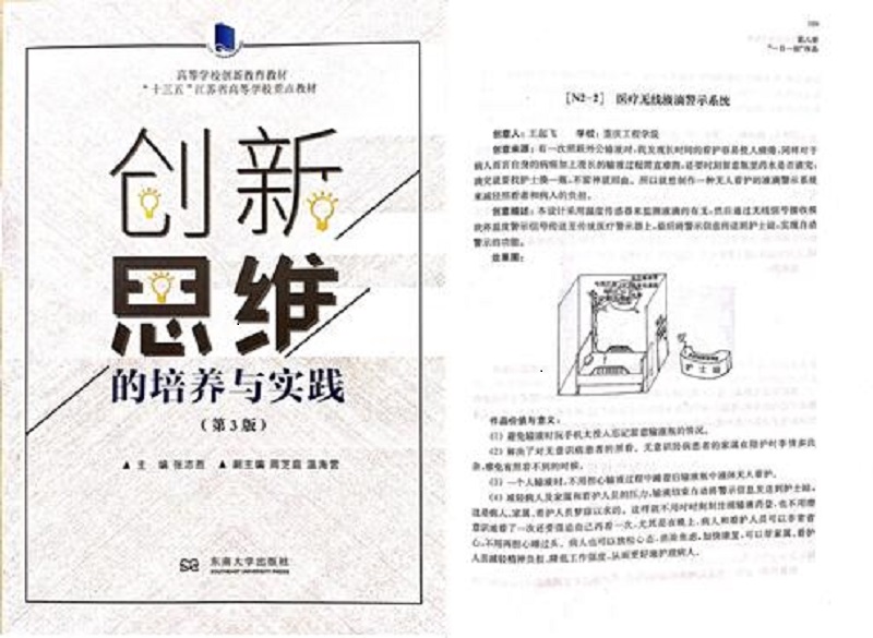 本网讯(文/图 通识学院 杨佳丽)11月12日,东南大学机械学院院长张志胜教授出版了第3版《创新思维的培养与实践》。该教材作为高等学校创造力开发训练课程的本科生教材,在众多的获奖作品中选取八个作品作为创新实践经典案例,我校学生王起飞(指导教师张楠)的《医疗无线液滴警示系统》和邓鑫、韩玉鹏和蔡华(指导教师张楠)的《自动塑易皮影》成功入选2019年经典创新实践经典案例。
