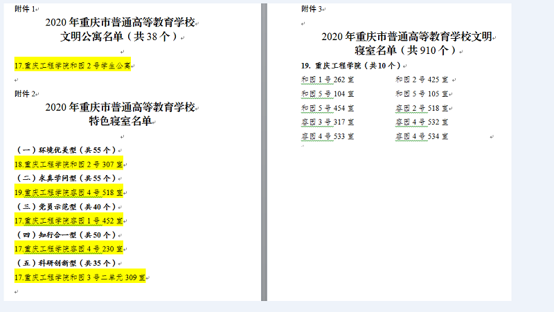 本讯网(文/图 学生处 祝毅)近日,重庆市教委发布了《关于2020年普通高校文明公寓和文明寝室评选结果的通知》,在市教委领导的工作指导下,我校和园2号公寓荣获重庆市普通高等教育学校“文明公寓”称号,和园2号307室、容园4号518室、容园1号452室、容园4号230室、和园3号二单元309室5个学生寝室荣获“特色寝室”称号,还有10个学生寝室荣获“文明寝室”称号。