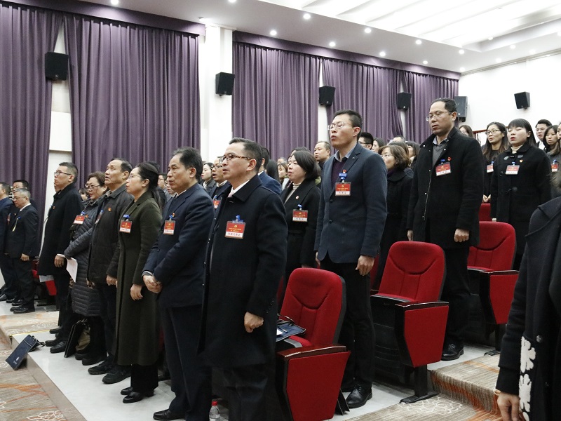 会议正式开始,全体参会人员起立,在庄严肃穆的音乐声中齐唱国歌。